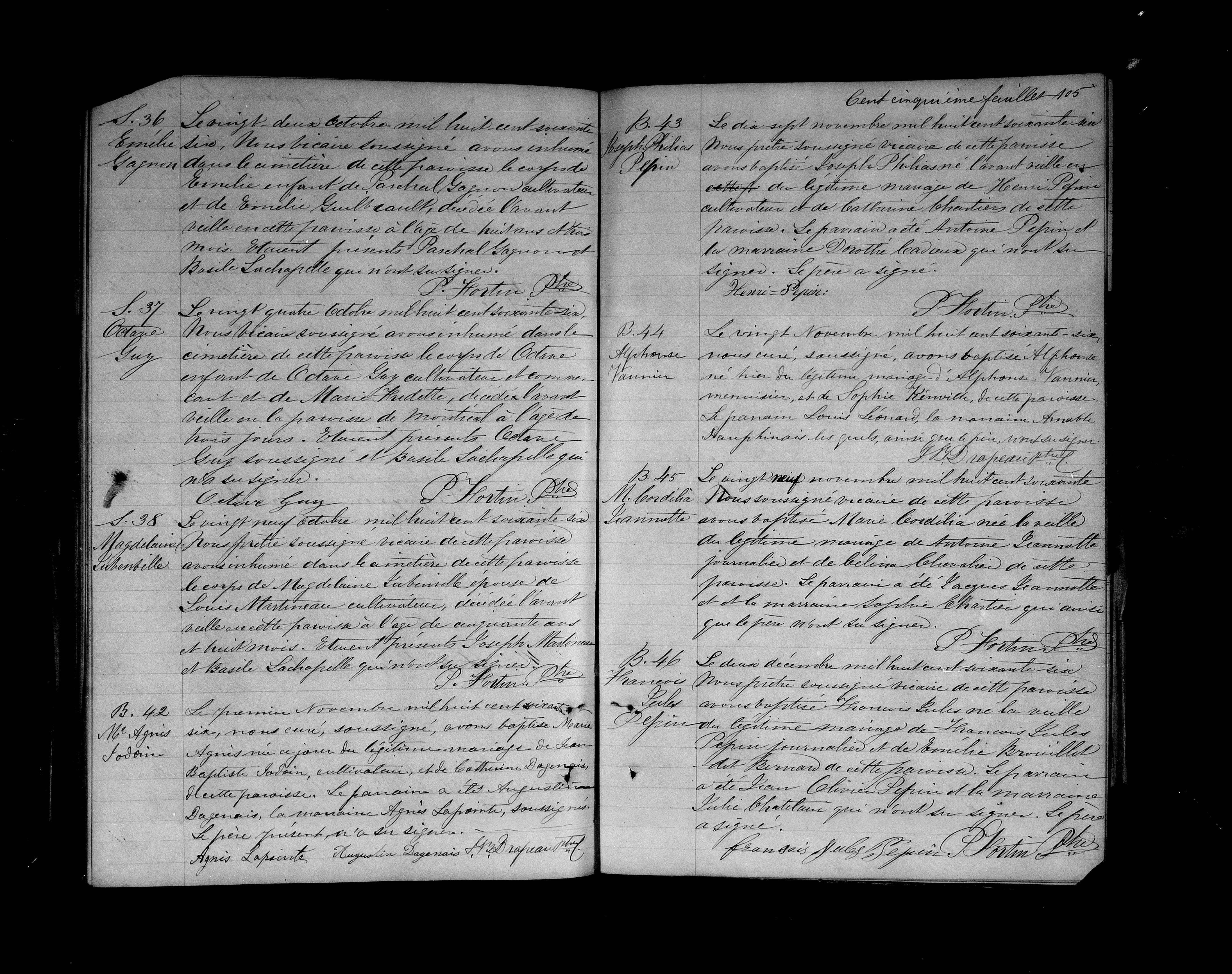 On the second of December eighteen hundred sixty-six, the undersigned priest of this parish baptized Francois Jules, born the day before, of the lawful marriage of François Jules Pepin, day laborer, and Emilie Brouillet dit Bernard of this parish. The godfather was Jean Olivier Pepin and the godmother Julie Chatelaine who were unable to sign. The father has signed.