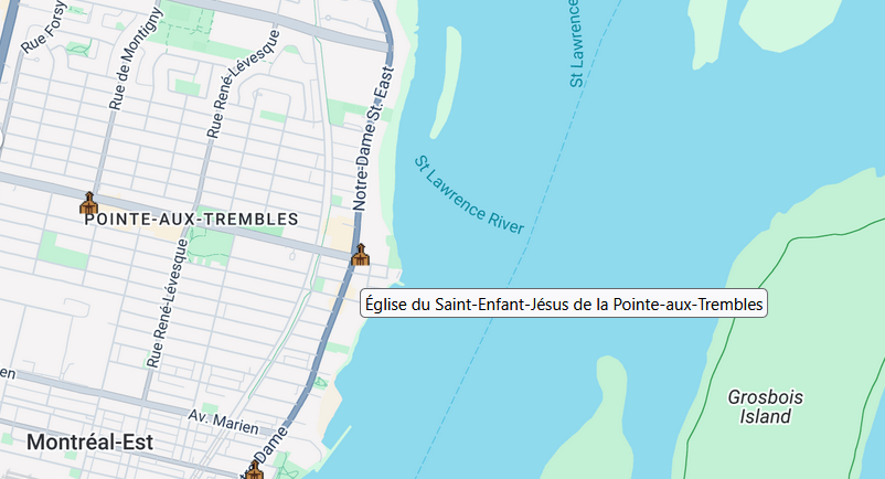 Thankfully, the website also included some searchable tables to narrow things down a bit. Interestingly, Pointe-aux-Trembles comes up as a city in Québéc and importantly, only five churches are listed. By zooming in on the map, we could see only 3 churches in the area. The first one we clicked on was established in 1959, so that was eliminated. The next one we clicked on, Église du Saint-Enfant-Jésus de la Pointe-aux-Trembles was established in 1678 which was promising! We also liked that the name of the chuch was the same as the neighborhood and matched the marriage card.