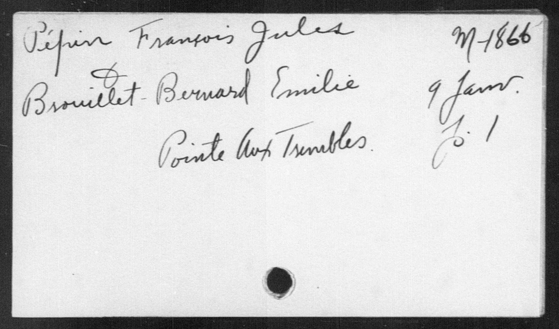 The marriage card showed Jules’ parents, Jules Pepin and Emilie Bernard, were married on January 9th in 1866. It also included the note Pointe-aux-Trembles. What did this mean? Was this the name of the church? The place?