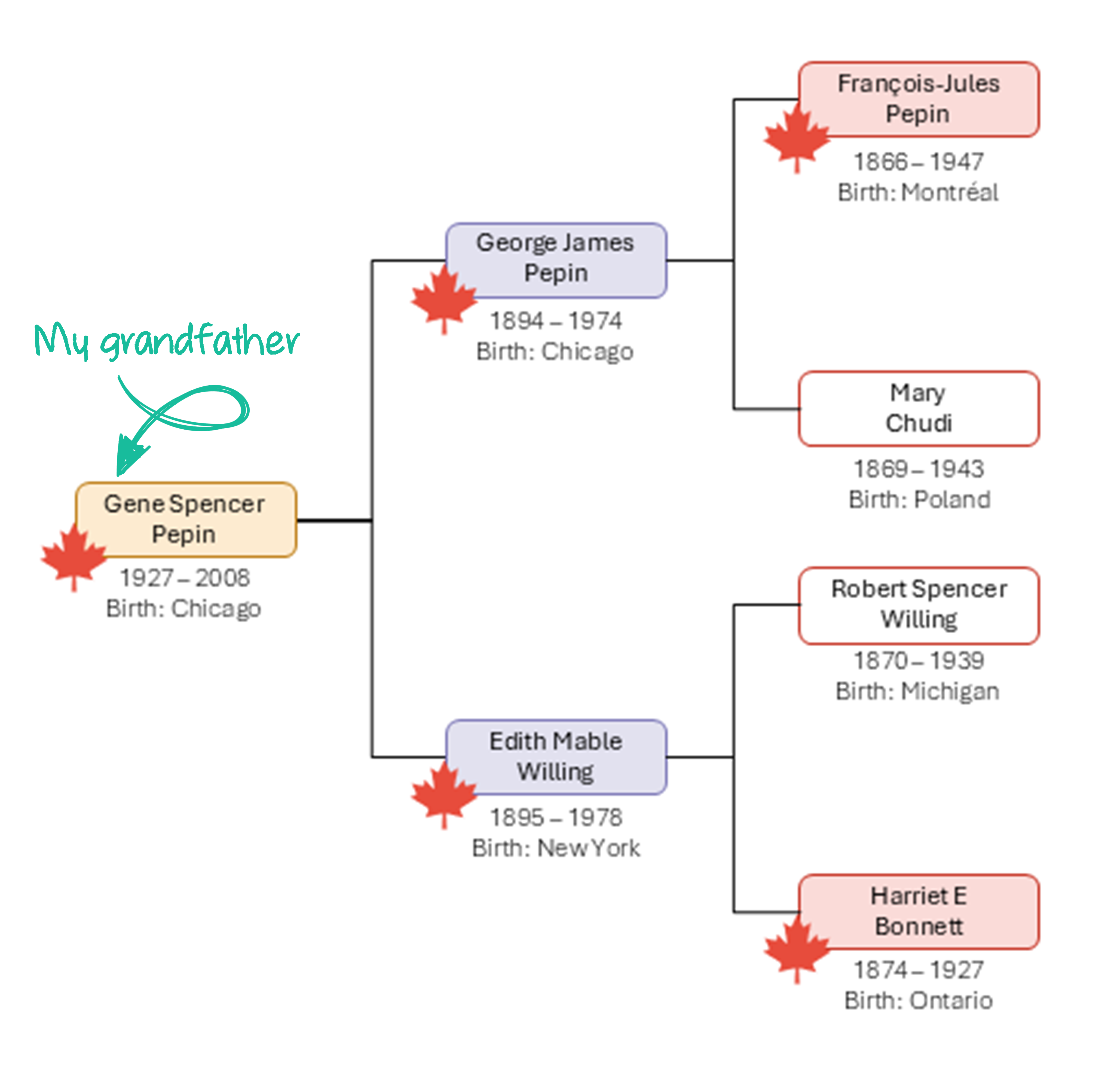 I was able to demonstrate my Canadian ancestry through my paternal grandfather, Gene Pepin. While neither of my grandfather’s parents were born in Canada, his paternal grandfather and maternal grandmother were both born in Canada. That makes his parents first generation Canadians.